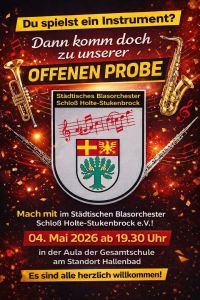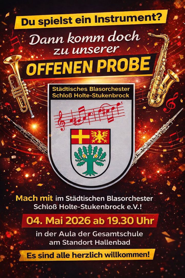 Am Montag 4. Mai veranstaltet das Städtische Blasorchester eine offene Probe. Alle musikbegeisterten Kinder, Jugendliche oder auch junggebliebenen Erwachsene die schon ein Instrument spielen oder auch erlernen wollen sind an diesem Montag herzlich eingeladen. Der Beginn in der Gesamtschule am Hallenbad ist um 19.30 Uhr.